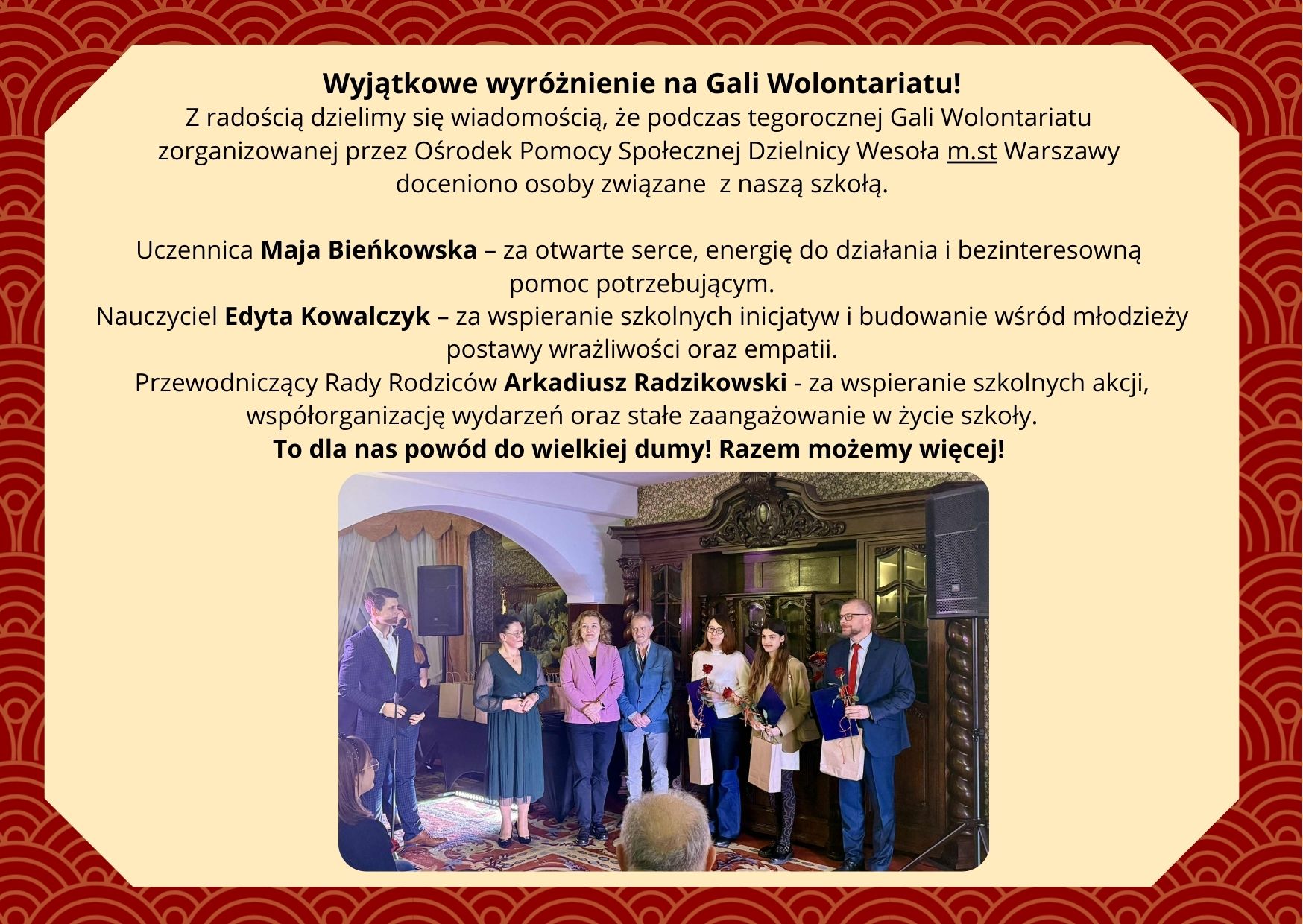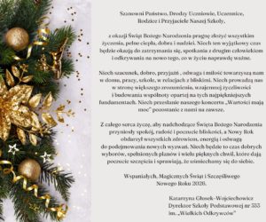jeszcze raz serdecznie dziękuję za zaproszenie na koncert “Wartości mają moc!”. Niestety, z przyczyn osobistych nie mogę wziąć udziału w tym magicznym wydarzeniu. Moje serce zawsze rwało się do spotkania w szkole, w której jest tyle mądrości, wrażliwości, przyjaznej atmosfery. W Waszej szkole jest po prostu moc. Tym bardziej więc żałuję, że tym razem los pozbawia mnie możliwości bycia z Wami.