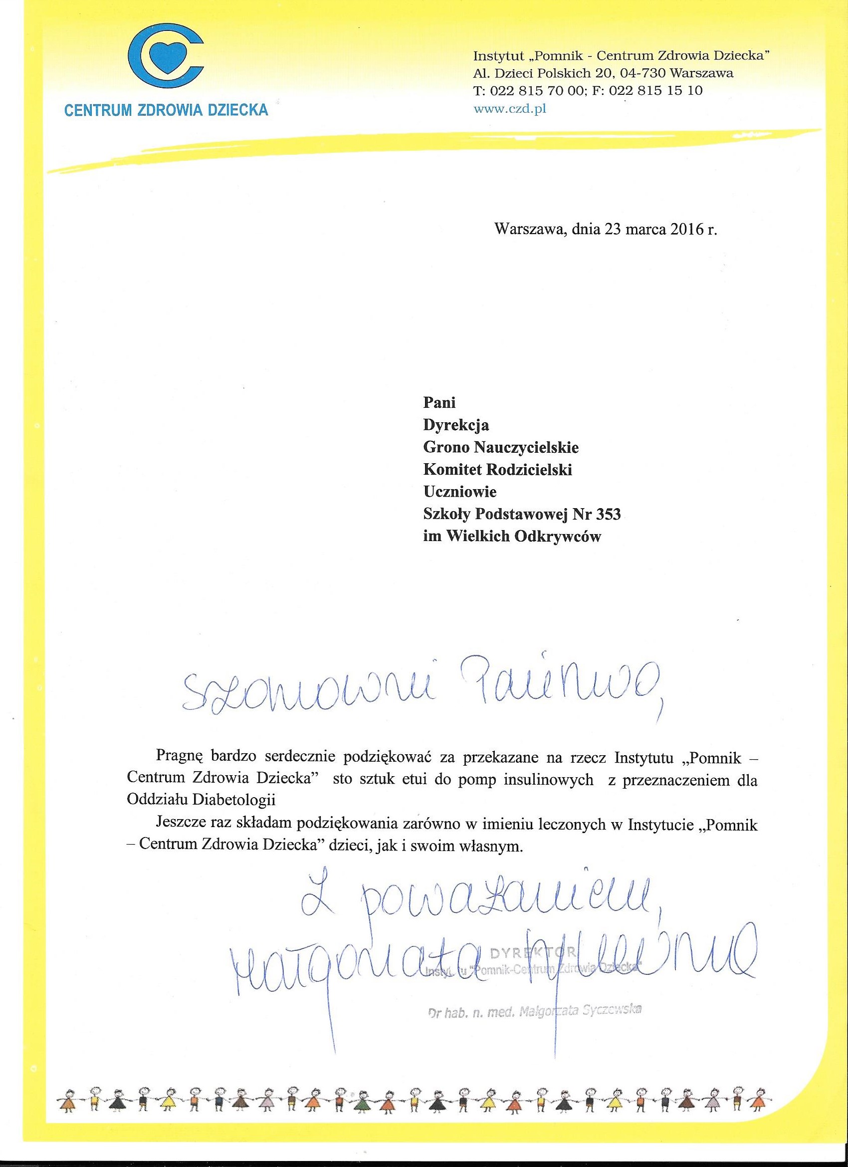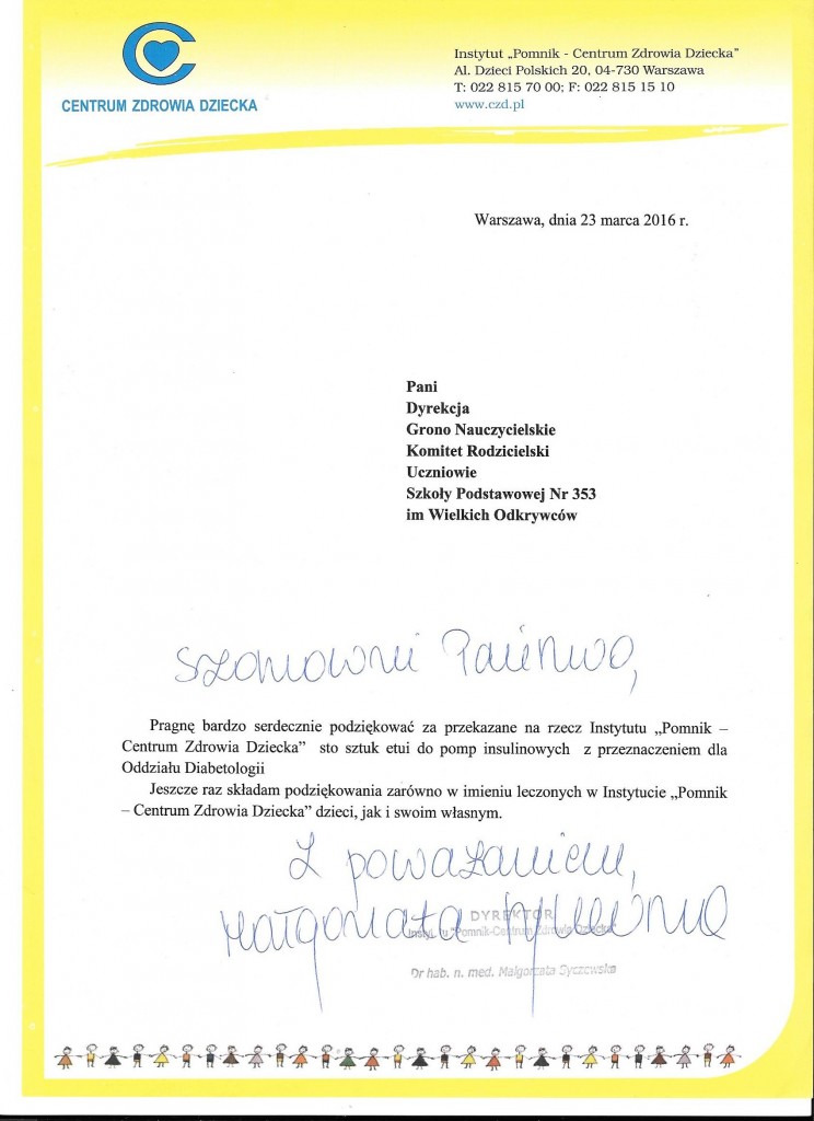 Podziękowania z Centrum Zdrowia Dziecka